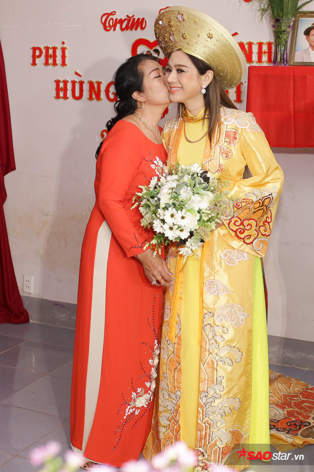Lâm Khánh Chi cũng nổi bật không kém bằng bộ áo dài vàng độc đáo với điểm nhấn là phần tà áo dài “quét đất”.