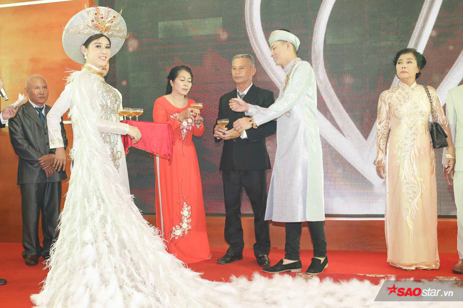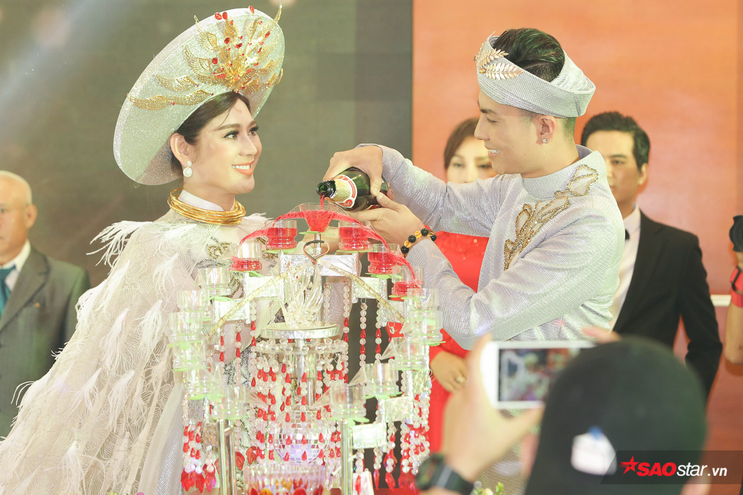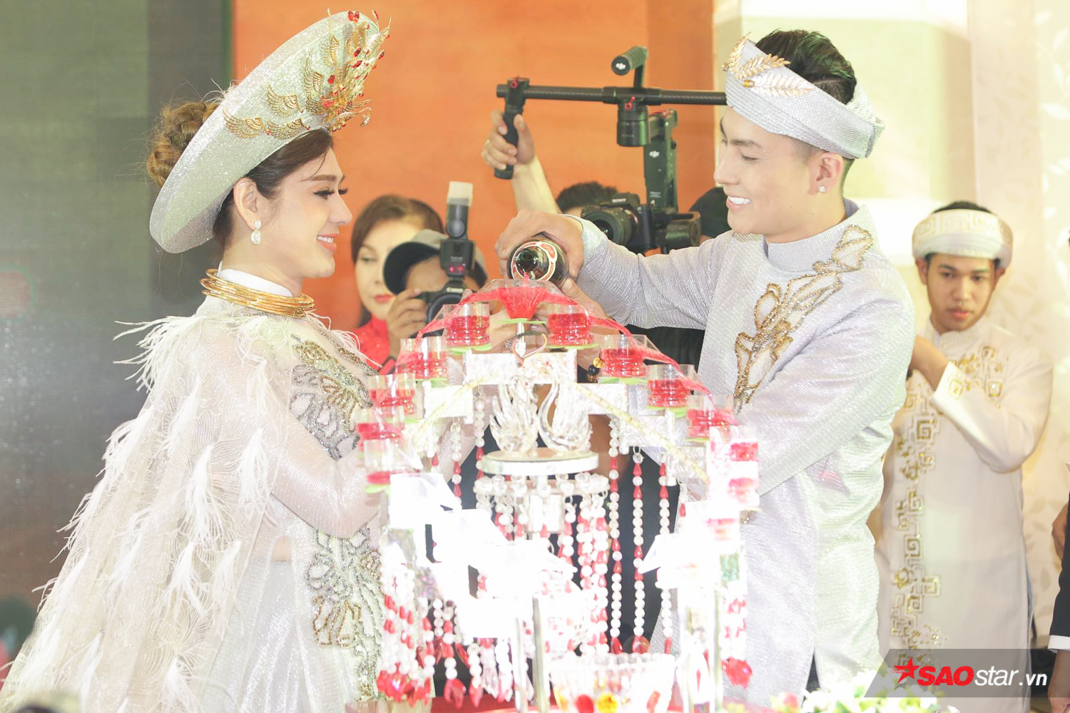 Lâm Khánh Chi uống ly rượu giao bôi cùng ông xã Phi Hùng, chính thức cả hai nên duyên chồng vợ.