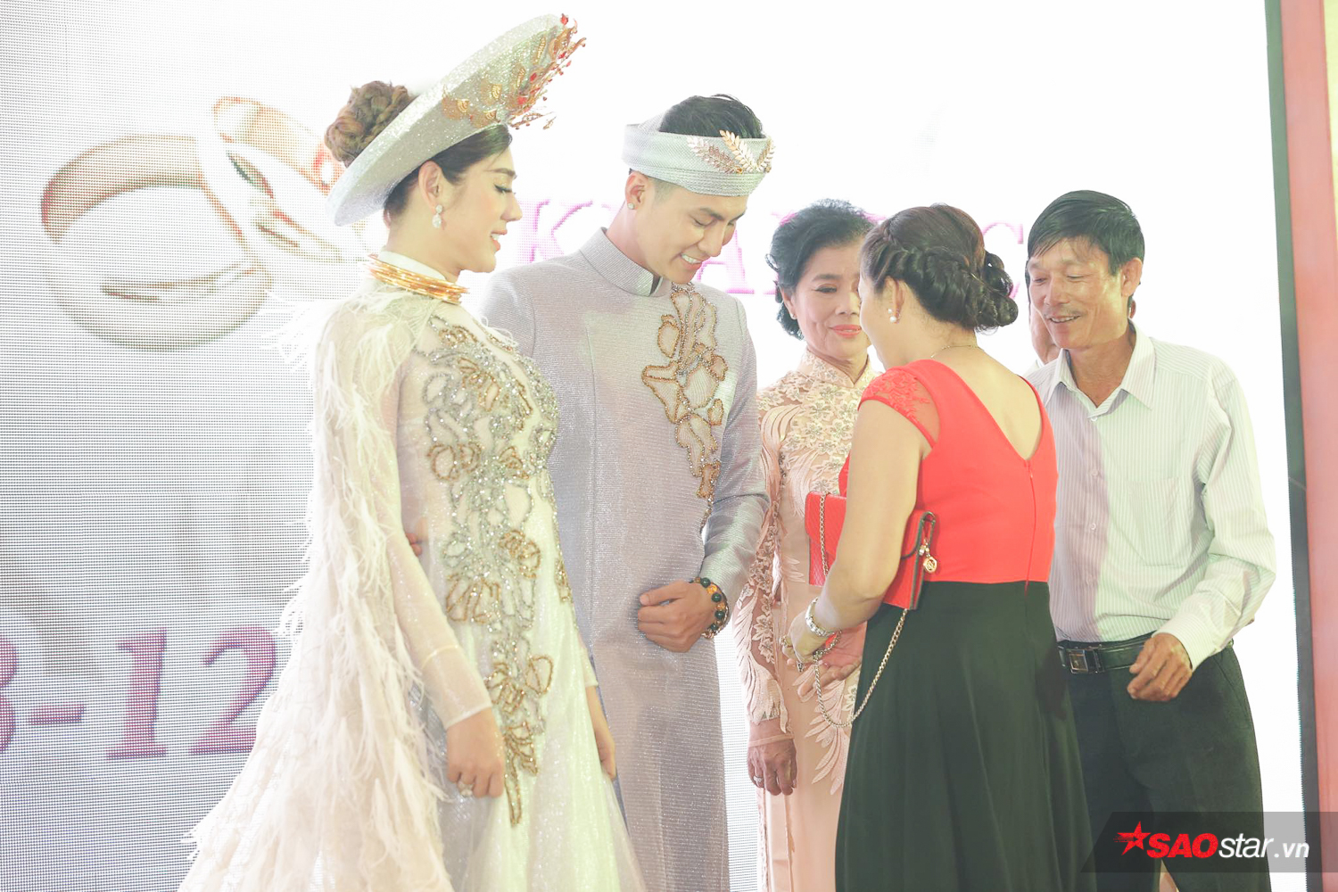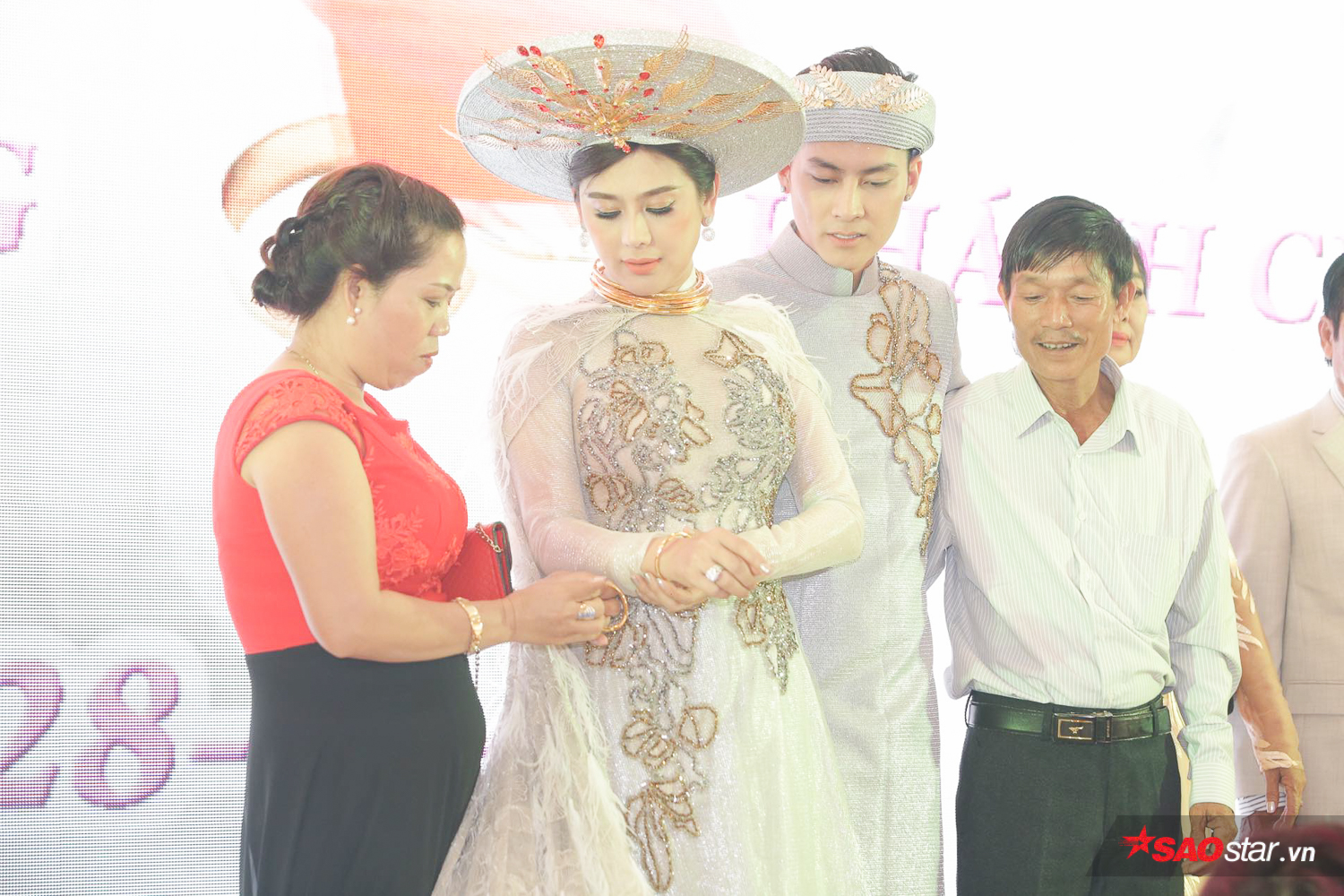 Vợ chồng Lâm Khánh Chi được người thân lên sân khấu tặng quà mừng cưới.