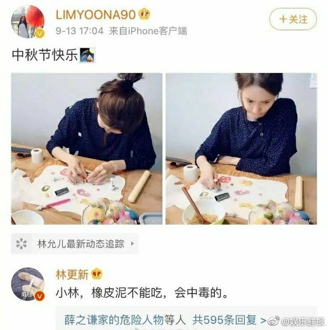 YoonA đăng ảnh chơi đất sét, kèm caption “Trung thu vui vẻ”. Lâm Canh Tân: “Tiểu Lâm, đất sét không thể ăn, sẽ trúng độc đó”.