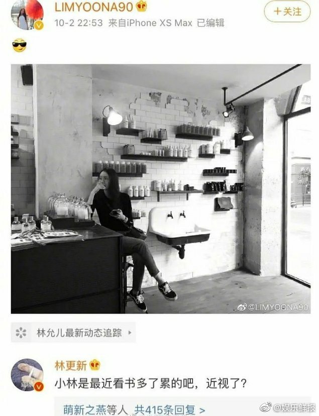 YoonA tiếp tục đăng tải ảnh khoe mình đeo mắt kính, kèm icon cũng đeo mắt kính. Lâm Canh Tân: “Tiểu Lâm gần đây đọc nhiều sách nên mệt phải không, cận thị rồi?”