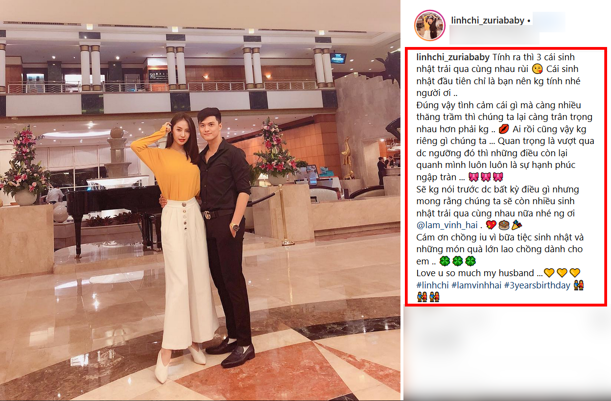 Lần sinh nhật gần đây nhất Linh Chi đăng status cảm ơn Lâm Vinh Hải và chia sẻ sự hạnh phúc khi được ở bên nhau.