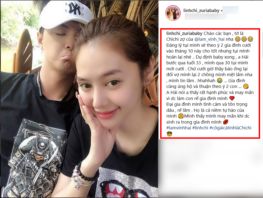 Cách đây không lâu, Linh Chi từng hé lộ chuyện đám cưới của hai người thật ra đã được dự tính tổ chức vào tháng 10 và chia sẻ rằng Lâm Vinh Hải cũng rất được lòng ba mẹ cô. Tuy nhiên, do một số lý do, gia đình hai bên quyết định sẽ dời lại đám cưới vào một khoảng thời gian thích hợp nhất để mọi thứ được suôn sẻ. Đó cũng là câu trả lời cho việc công khai xưng hô vợ, chồng dù chưa chính thức về chung một nhà.
