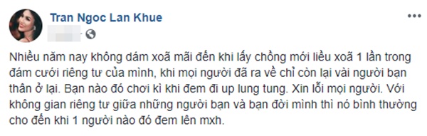 Theo đó, Lan khuê bức xúc: “Nhiều năm nay không dám xõa mãi đến khi lấy chồng mới liều xõa 1 lần trong đám cưới riêng tư của mình, khi mọi người đã ra về chỉ còn lại vài người bạn thân ở lại. Bạn nào đó chơi kì khi đem đi up lung tung. Xin lỗi mọi người. Với không gian riêng tư giữa những người bạn và bạn đời mình thì nó bình thường cho đến khi 1 người nào đó đem lên mạng xã hội“.