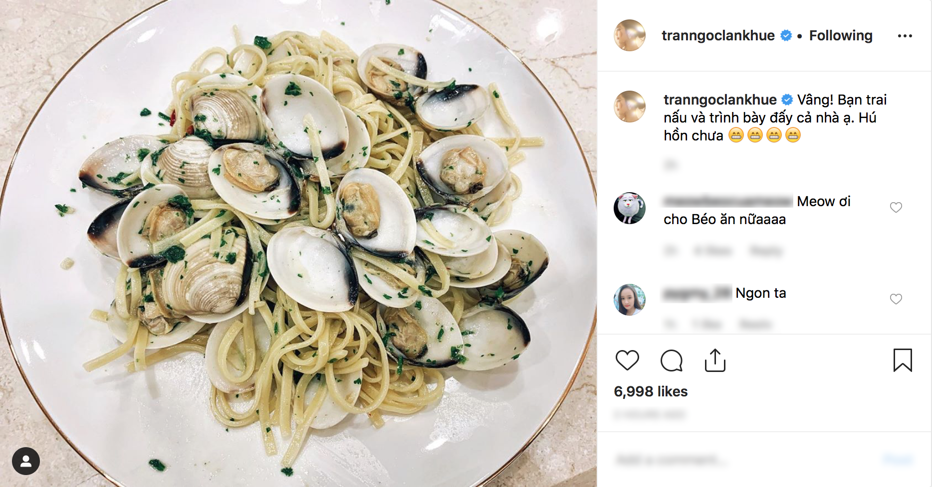 Trên tài khoản của nữ siêu mẫu, Lan Khuê cũng hài hước và hạnh phúc chia sẻ thành phẩm của ông xã kèm dòng tin: “Vâng ạ! Bạn trai nấu và trình bày đấy cả nhà ạ. Hú hồn chưa!”.