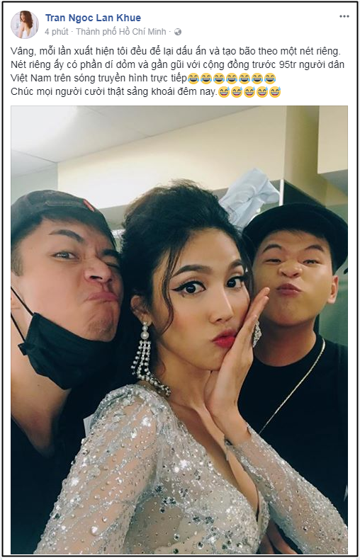 Theo đó, Lan Khuê viết: “Vâng, mỗi lần xuất hiện tôi đều để lại dấu ấn và tạo bão theo một nét riêng. Nét riêng ấy có phần dí dỏm và gần gũi với cộng đồng trước 95 triệu người dân Việt Nam trên sóng truyền hình trực tiếp. Chúc mọi người cười thật sảng khoái đêm nay”.