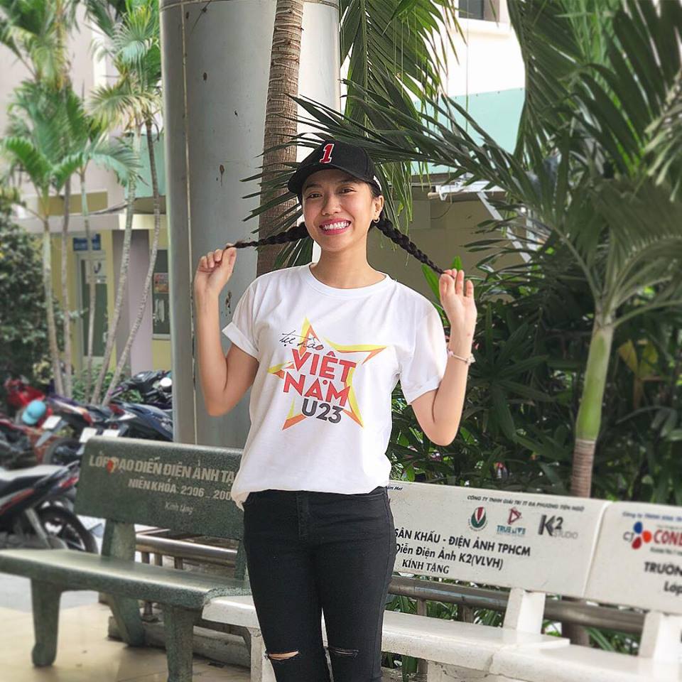 Diệu Nhi diện áo phông U23 Việt Nam để cổ vũ cho đội tuyển.