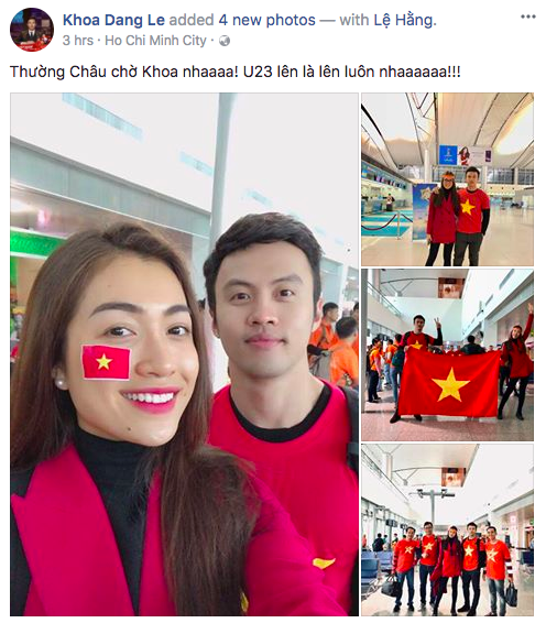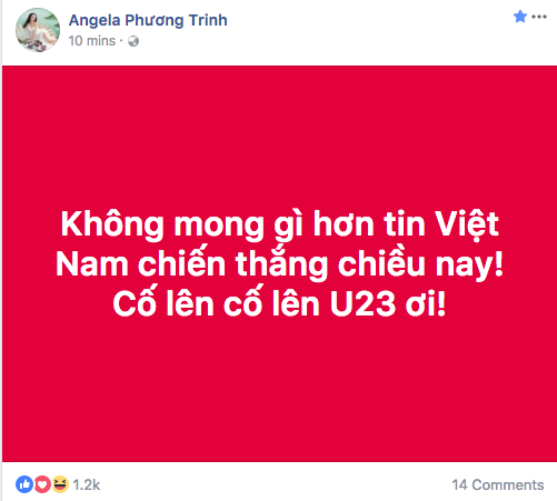 Không chỉ khán giả, sao Việt cũng chẳng ngoại lệ. Trên trang cá nhân, đông đảo nghệ sĩ V-biz như Minh Tú, Lan Khuê, Angela Phương Trinh, Mâu Thuỷ, Thanh Duy, Duy Mạnh… đều chia sẻ bài viết cổ vũ đội tuyển U23 Việt Nam.