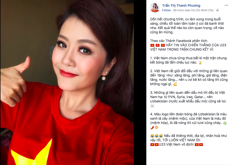 MC Thanh Phương đã hoàn thành hết công việc trong buổi sáng để buổi chiều trống lịch, cổ vũ cho U23.