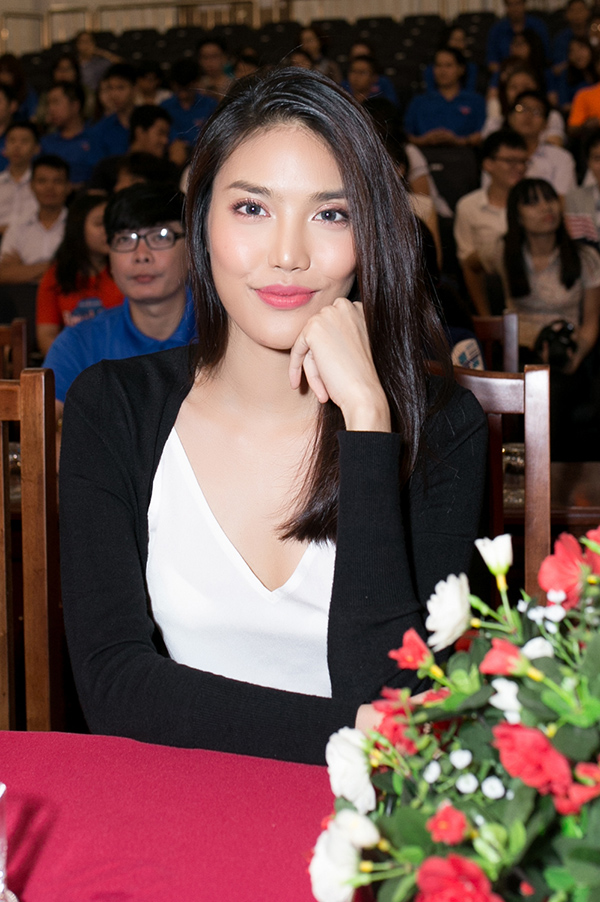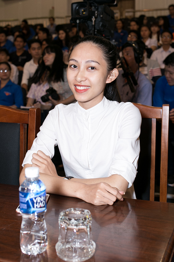 Người đẹp dành thời gian giao lưu, chụp hình cùng các bạn sinh viên.
