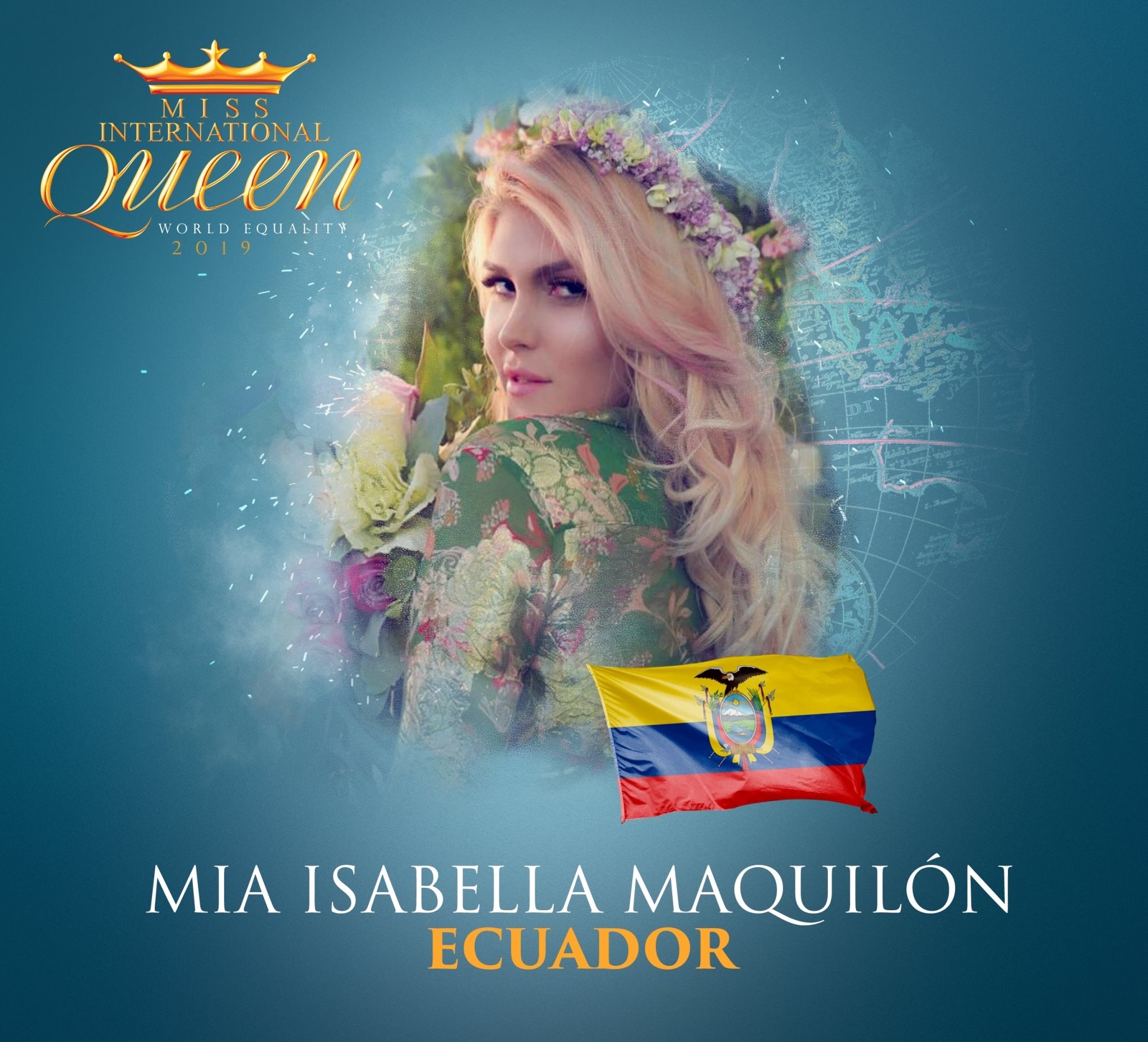 Hoa hậu Ecuador - Mia Isabella đến với MIQ 2019 khi vừa tròn 26 tuổi và hiện đang là người mẫu, nhà thiết kế đồ hoạ và là quản lý cho công ty của gia đình. Mia mang đến cuộc thi một câu chuyện thú vị nhưng cũng rất ý nghĩa đối với người chuyển giới: “Khi mẹ mang thai tôi, bác sĩ nói rằng trong bụng mẹ là một bé gái, nhưng khi sinh ra lại là một cậu con trai, điều này làm ba mẹ tôi cảm thấy vui mừng khôn xiết. Nhưng kể từ giây phút đó, tôi tin rằng, đó là một tín hiệu. Và một ngày, cậu con con trai đó cảm thấy có một bé gái bị mắc kẹt lại bên trong chính con người mình. Đến khi đủ 18 tuổi, tôi quyết định sống đúng với con người thật sự của minh và cho đến hiện tại, tôi là một người phụ nữ trao quyền và tôi đã sẵn sàng cho thế giới thấy rằng, không gì có thể ngăn cản được tôi”.