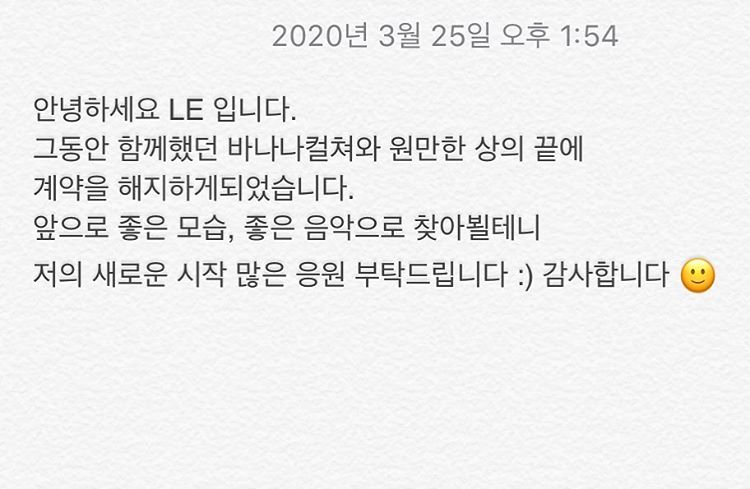 Trên instagram của mình, LE gửi tuyên bố tới người hâm mộ:”Xin chào, tôi là LE. Sau khi thảo luận suôn sẻ với Banana Culture, tôi quyết định hủy hợp đồng với họ. Tôi sẽ trở lại sớm với âm nhạc và hình ảnh tốt, vì vậy hãy cổ vũ cho sự khởi đầu mới của tôi. Cảm ơn các bạn”.