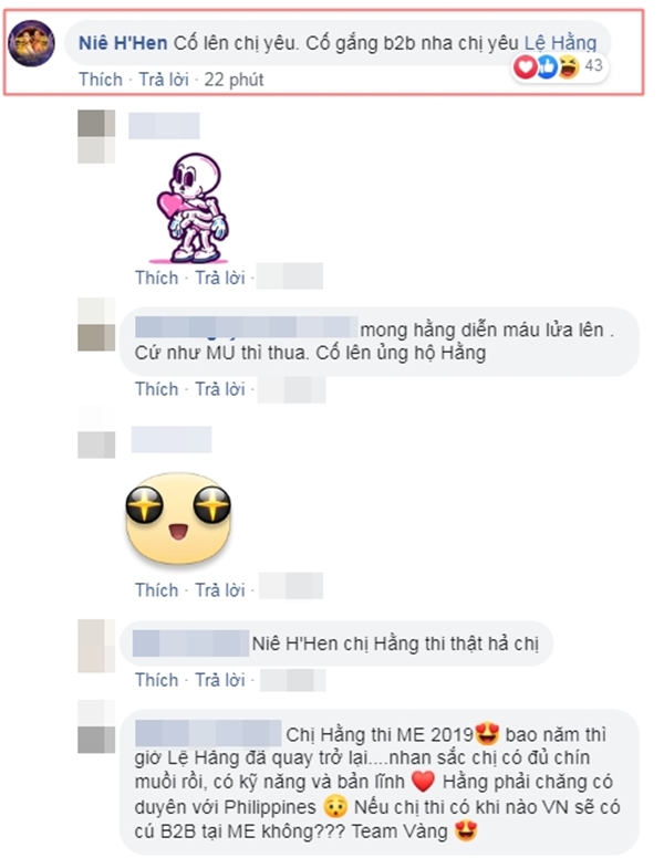 Bên dưới hình ảnh Lệ Hằng được các fan đăng tải, đương kim Hoa hậu Hoàn vũ Việt Nam - H'Hen Niê để lại bình luận: “Cố lên! Cố gắng Back To Back nha chị yêu“. Là đồng nghiệp thân thiết, hợp tác trong nhiều dự án và gameshow, lời động viên H'Hen Niê dành cho Lệ Hằng khiến fan càng thêm tin tưởng người đẹp Đà Nẵng sẽ đại diện Việt Nam dự thi Miss Earth 2019.