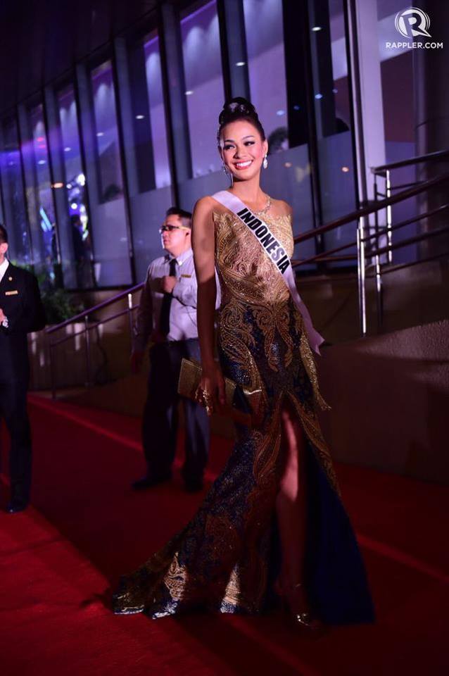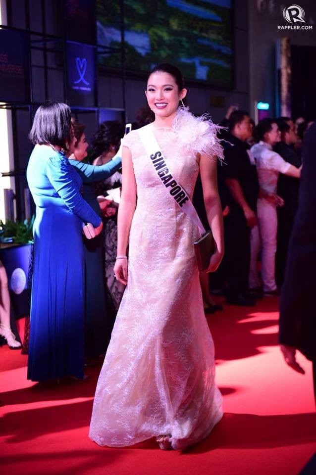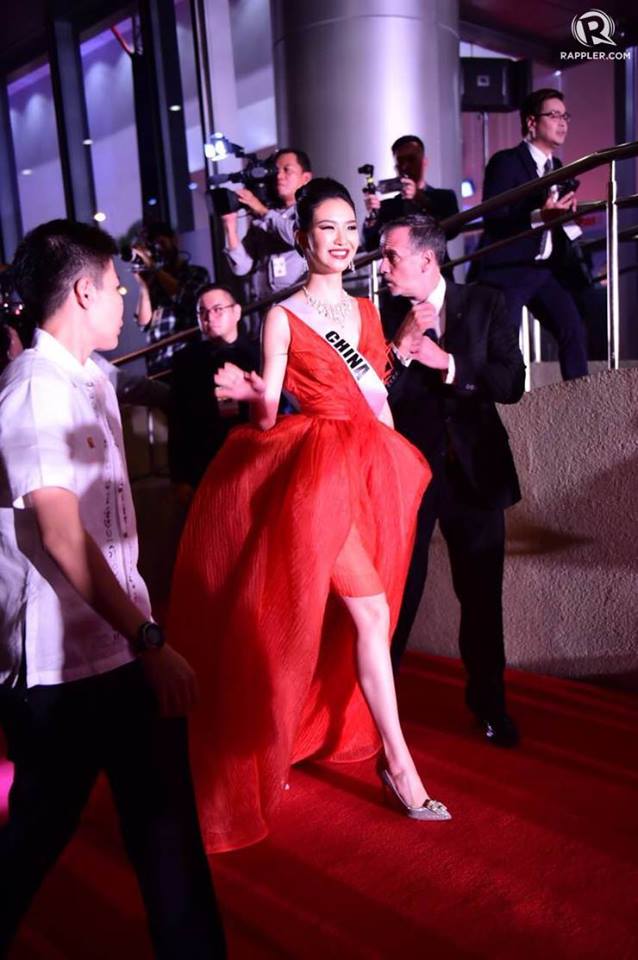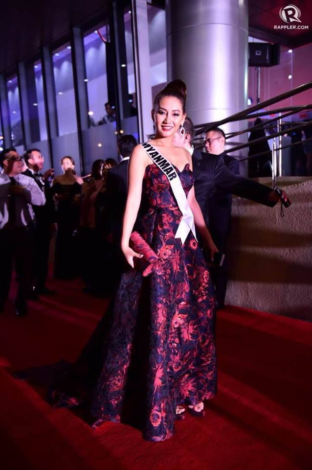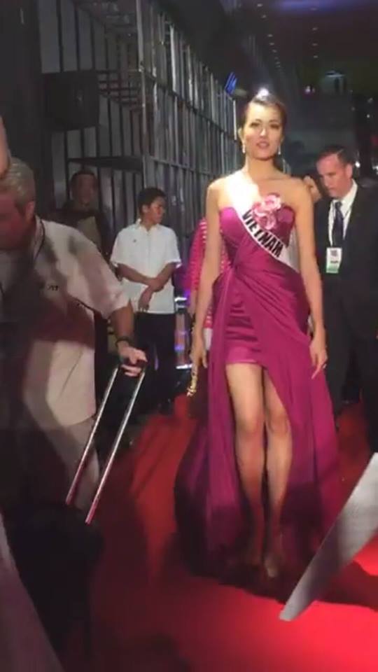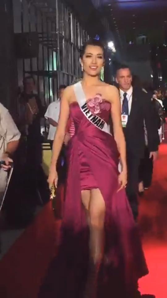 Trong khi đó, các thí sinh đến từ nhiều quốc gia cũng khoác lên mình những bộ đầm dạ hội quyến rũ. Đặc biệt, đại diện Việt Nam - Á hậu Lệ Hằng vô cùng nổi bật giữa rừng hoa hồng với bội đầm cúp ngực, chân váy xẻ cao của thương hiệu Joli Poli. Theo tiết lộ mới nhất từ Lệ Hằng, do không có nhiều thời gian chuẩn bị nên cô đã tự tay trang điểm và làm tóc cho mình để tham gia bữa tiệc. Dù vậy, nhìn Lệ Hằng vẫn rất xinh đẹp, lộng lẫy không kém Hoa hậu Pia Wurtzbach ở bất cứ góc nhìn nào.