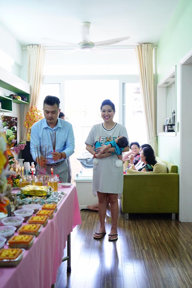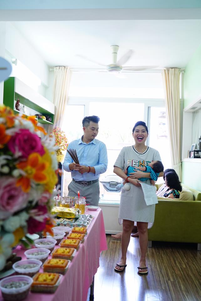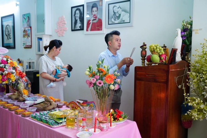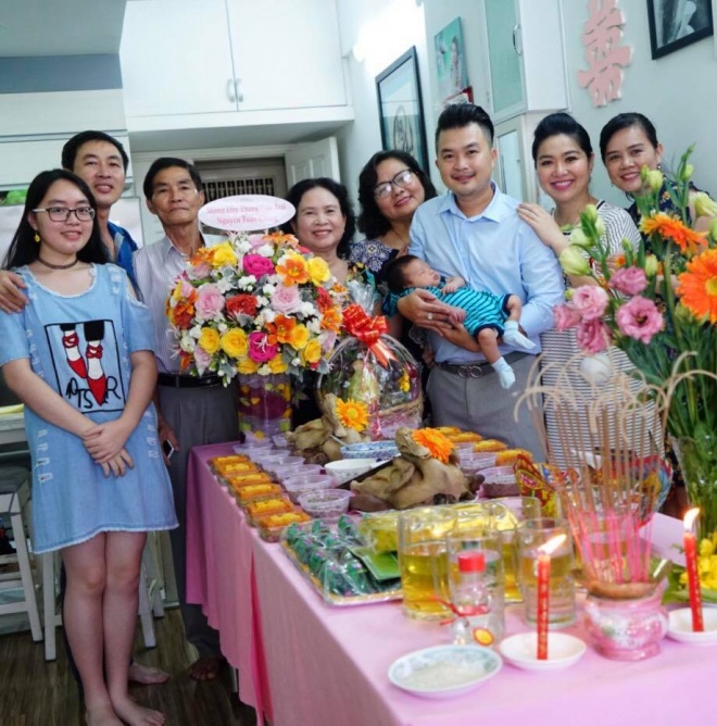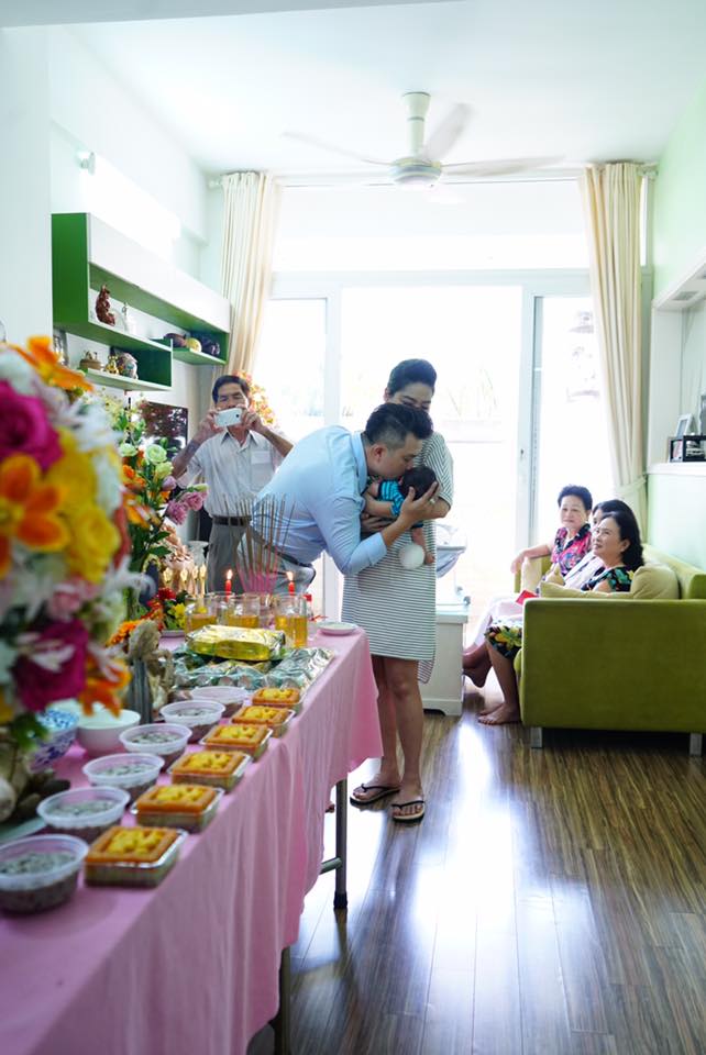 Theo đó, gia đình nhỏ của cô đã chuẩn bị mâm cỗ đầy đủ cũng đầy đủ cho con trai. Nhóc tì nhà Lê Khánh ngủ say mặc dù đã được mẹ bế.