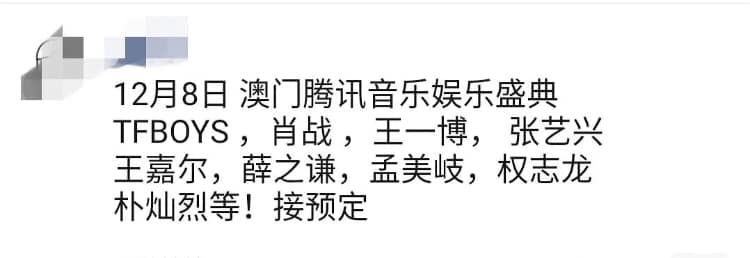 Mới đây, cộng đồng mạng xôn xao trước tin đồn về những khách mời đầu tiên tham dự lễ trao giải âm nhạc Tencent Music Entertainment Awards 2019. Theo đó, danh sách hé lộ gồm có: TFBOYS, Tiêu Chiến, Vương Nhất Bác, Trương Nghệ Hưng, Vương Gia Nhĩ, Tiết Chi Khiêm, Mạnh Mỹ Kỳ, EXO Chanyeol,…