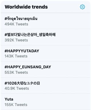 Tính toán theo tuổi phương Tây, Lee Eun Sang tròn 17 tuổi trong khi Yuta bước sang tuổi 24 tươi đẹp. Theo đó, fan đã tạo nên một ngày đặc biệt đáng nhớ và các chủ đề đã trở thành xu hướng trên toàn thế giới trên Twitter. Những chủ đề thịnh hành bao gồm #별보다빛나는은상아_생일축하해 (Eun Sang tỏa sáng hơn những vì sao _Chúc mừng sinh nhật) và #HAPPYYUTADAY, #HAPPY_EUNSANG_DAY và #Yuta.