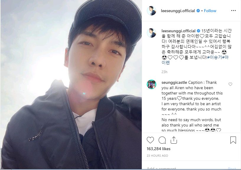 Ngày 5/6 năm nay, Lee Seung Gi đã đăng một tấm hình selfie lên Instagram với dòng thông điệp ngọt ngào gửi đến AIREN - tên gọi chung các fan hâm mộ của anh chàng. Dòng caption kết thúc với rất nhiều emoji trái tim. Nam nghệ sĩ viết,