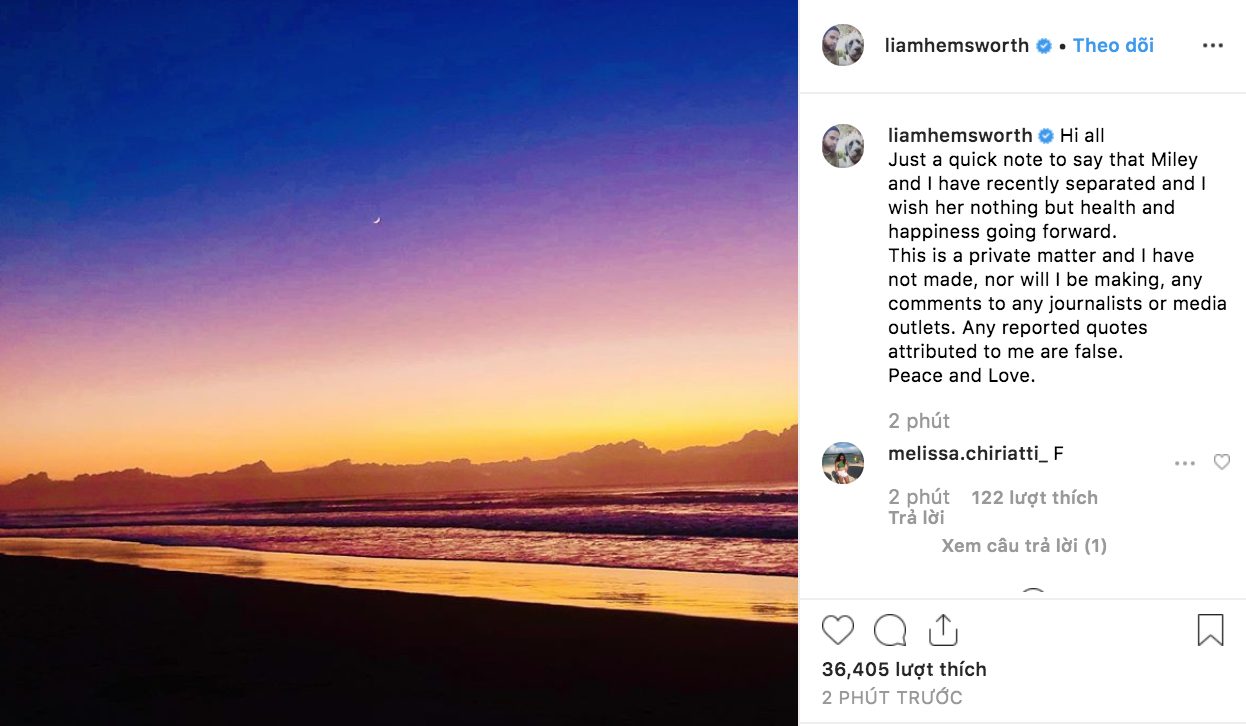 Cách đây ít phút, Liam Hemsworth đã có những dòng chia sẻ chính thức về vụ việc ly hôn. Anh viết: “Xin chào. Tôi chỉ muốn nói rằng thời gian gần đây tôi và Miley đã ly thân và tôi luôn mong cô ấy hạnh phúc và khỏe mạnh. Đây là một vấn đề riêng tư và tôi đã, đang và sẽ không đưa ra bất kỳ bình luận cho bất kỳ nhà báo hoặc phương tiện truyền thông nào. Bất kỳ phát ngôn nào trên báo cho rằng đó là của tôi đều là sai cả”.