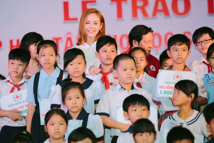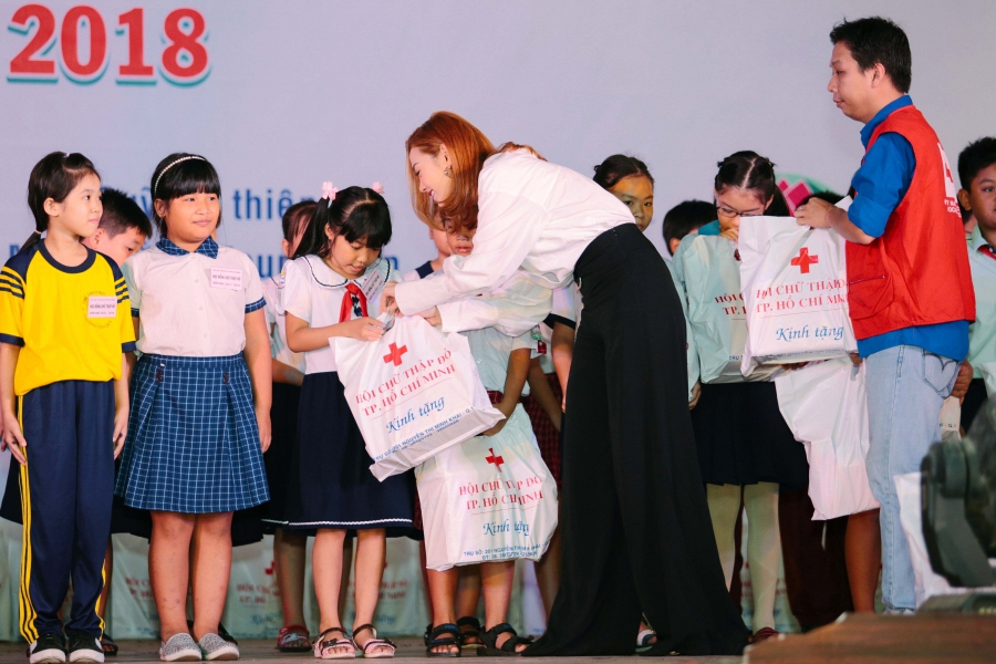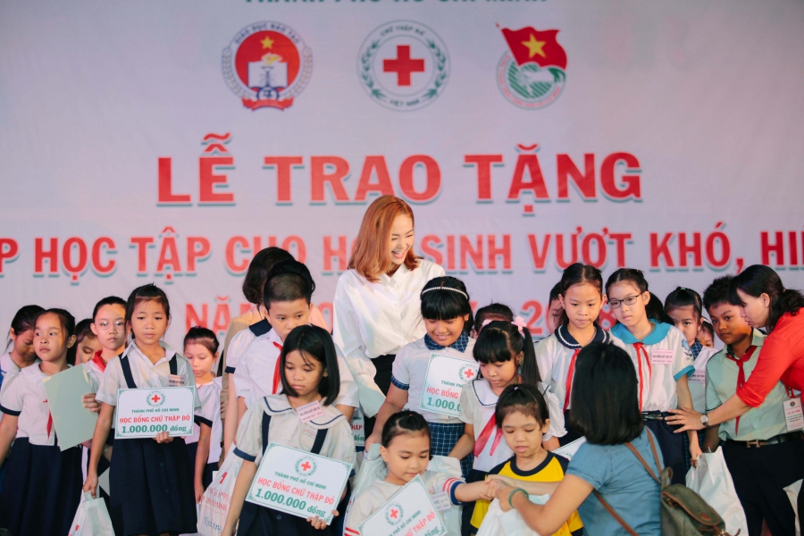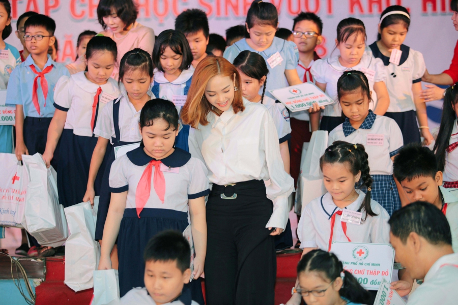 Là nhà tài trợ chính của chương trình Trợ cấp học tập do Hội Chữ thập đỏ TP. HCM phát động, Minh Hằng có mặt từ rất sớm trong hoạt động lần này. Xuất hiện tại buổi trao quà, người đẹp sinh năm 1987 diện trang phục thanh lịch, nhẹ nhàng nhưng vẫn toát lên vẻ xinh đẹp và rạng rỡ.