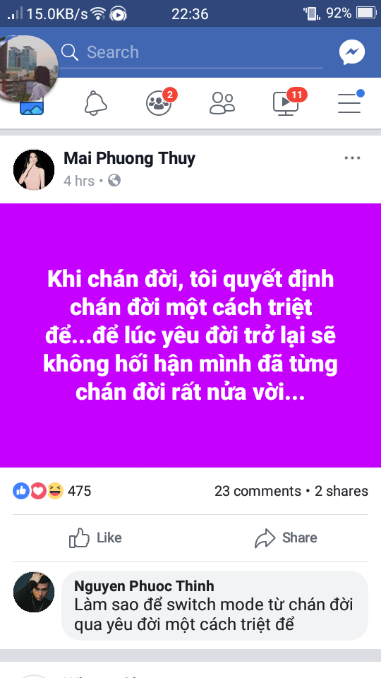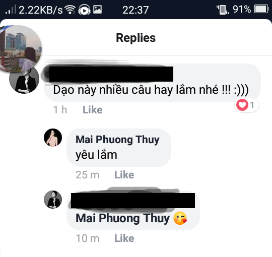 Cụ thể hôm qua Mai Phương Thúy đã đăng: “Khi chán đời, tôi quyết định chán đời một cách triệt để…để lúc yêu đời trở lại sẽ không hối hận mình đã từng chán đời rất nửa vời…” và nam ca sĩ Noo Phước Thịnh gần như ngay tức khắc để lại lời nhắn: “Làm sao để switch mode từ chán đời qua yêu đời một cách triệt để.” Không thể tình hơn khi Mai Phương Thúy trả lời: “Em không biết anh đẹp trai ạ.”