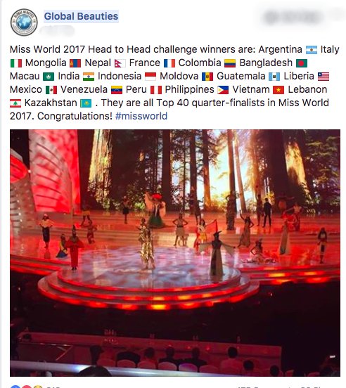 Mới đây, theo thông tin từ một fanpage sắc đẹp uy tín, Miss World 2017 đã công bố những người đẹp chiến thắng phần thi phụ mang tên thử thách Head to head (Đối đầu).