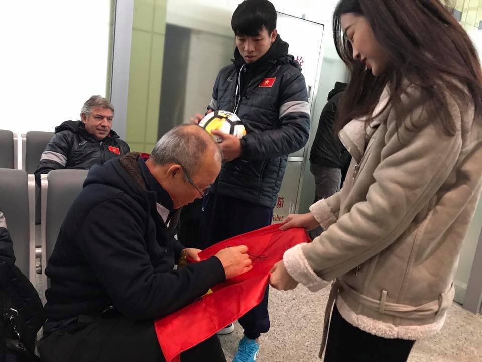 Tại sân bay, Đỗ Mỹ Linh tranh thủ xin chữ ký của cầu thủ U23 Việt Nam và HLV Park Hang-seo lên Quốc kỳ.