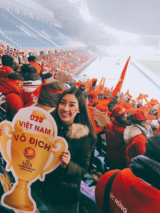 Chiều ngày 27/1, Hoa hậu Đỗ Mỹ Linh và Á hậu Ngô Thanh Tú có mặt tại sân vận động Thường Châu (Trung Quốc) để ủng hộ trận chung kết giải vô địch châu Á giữa đội tuyển U23 Việt Nam - U23 Uzberkistan. Hai người đẹp khiến công chúng ganh tỵ khi ghi lại những khoảnh khắc gặp gỡ trực tiếp các cầu thủ cùng HLV Park Hang-seo.