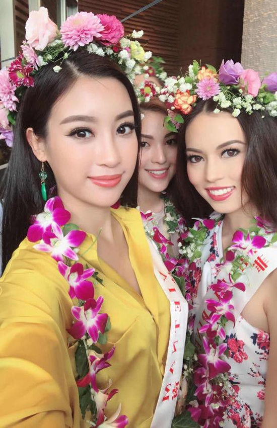 Hoa hậu Việt Nam 2016 khoe sắc trong bộ váy vàng, vui vẻ chụp ảnh tự sướng cùng đại diện đến từ Philippines và Venezuela.