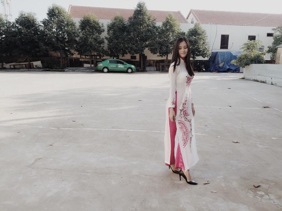 Ngay cả khi diện áo dài, thần thái của một Hoa hậu cũng được toát ra, nhẹ nhàng với khuôn mặt khả ái và đôi chân dài miên man.