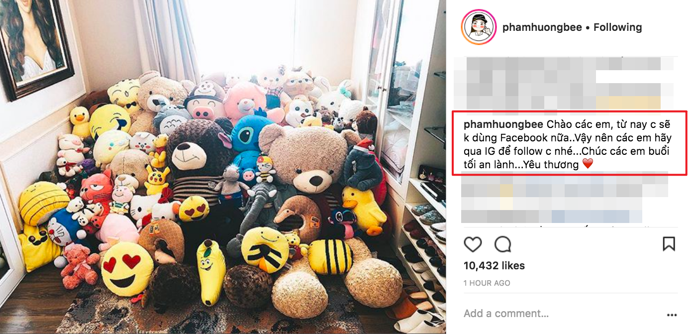 Hương không thể mãi chiều lòng dư luận bằng cách giải quyết những tin đồn, những tò mò mỗi ngày. Mình đi tìm sự bình yên và trả lời những xì xào đó bằng thành quả công việc mà mình đã cố gắng xây dựng… Đóng Facebook vì mình không còn tìm thấy niềm vui khi chơi Facebook. Nếu các bạn yêu quý mình có thể tiếp tục ủng hộ mình tại Instagram”.