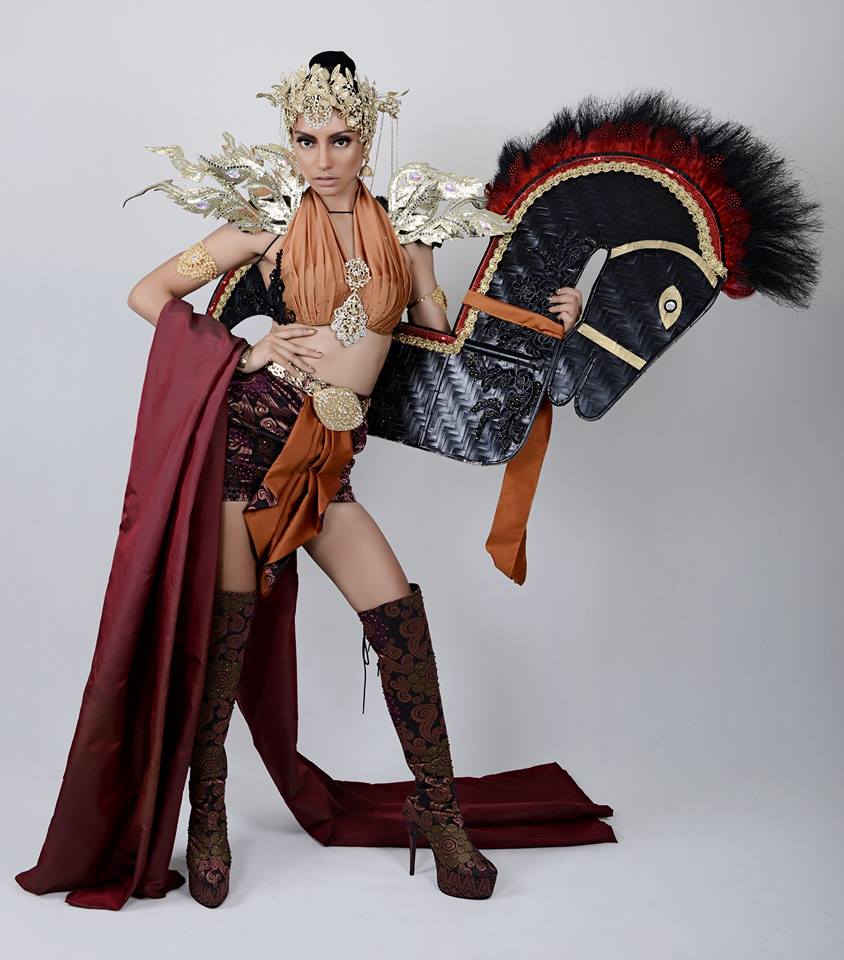 Dea Goesti Rizkita - đại diện của Indonesia, xuất hiện lộng lẫy với bộ trang phục cầu kỳ. Phần chân váy đặc biệt nổi bật với chi tiết mô hình của những ngôi đền, đậm nét văn hóa truyền thống. Người đẹp 24 tuổi cho biết đây không chỉ đơn giản là một cuộc thi để cân đo xem ai đẹp hơn, ai tốt hơn.