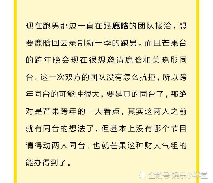 Bên cạnh đó, những nhà đài lớn của Trung Quốc đang tiến hành lập danh sách khách mời cho đêm hội chào đón năm mới 2020. Theo nguồn tin mới đây tiết lộ đài Hồ Nam đã gửi lời mời đến cặp đôi Lộc Hàm và Quan Hiểu Đồng. Sau khi công khai tình cảm, cặp đôi này không tham gia cùng nhau bất kỳ chương trình nào. Họ cũng không phô trương hay thể hiện tình cảm lộ liễu trước công chúng.