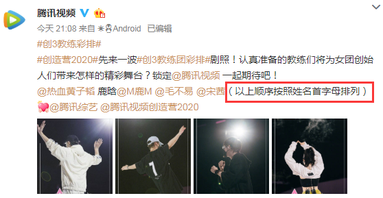 Sáng tạo doanh 2020 đã bắt đầu khởi động, bốn huấn luận viên: Lộc Hàm, Hoàng Tử Thao, Mao Bất Dịch, Tống Thiến đã đến Thâm Quyến để ghi hình. Vì tình hình dịch bệnh, La Chí Tường tạm thời chưa xuất hiện, Đại Trương Vỹ sẽ thay thế. Có thể nói rằng đội hình này trước nay chưa từng có. Dàn huấn luyện viên thu hút sự chú ý rất lớn của mọi người, chương trình chưa phát sóng đã nổi tiếng.