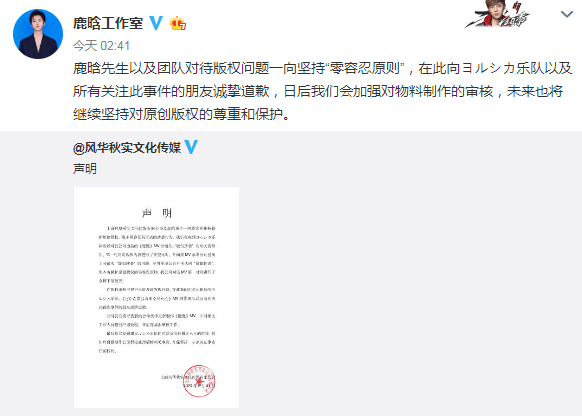 Phòng làm việc cho biết: “Lộc Hàm và phía công ty đối với vấn đề bản quyền luôn kiên trì với nguyên tắc “không khoan nhượng”. Tại đây xin gởi lời xin lỗi chân thành đến nhóm Yorushika (ヨルシカ) và những tất cả bằng hữu đã chú ý đến chuyện này. Sau này, chúng tôi sẽ sẽ tăng cường xét duyệt đối với chuyện chế tác, tương lai sẽ tiếp tục kiên trì tôn trọng và bảo vệ bản quyền đối với nguyên tác”.