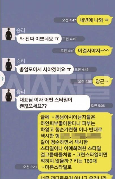 Giám đốc: Năm sau anh sẽ tới Seungri: Oa, thật sự đẹp quá đi Giám đốc: Anh sẽ mua cái này Seungri: Em cũng phải gom mua mới được Giám đốc: Đương nhiên Seungri: Giám đốc anh thích kiểu con gái như thế nào ạ? Giám đốc: Đàn ông Đông Nam Á thường thích phụ nữ da trắng, cực kì thơ ngây hoặc ngược lại là cực kì gợi cảm. Giống như girlgroup ấy. Style đó liệu có dễ để mình ăn không? Chiều cao khoảng 160 cm, dáng người thanh mảnh. (nguồn dịch: Lostbird)