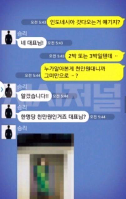Giám đốc : Cậu đang nói về việc đến Indonesia? Seungri: Vâng đúng rồi anh. Giám đốc : Khoảng 2, 3 đêm gì đó. Chắc giá tầm 10 triệu won nhỉ? Seungri: Vâng, khoảng tầm mười triệu won cho mỗi cô. Seungri: Gửi ảnh (nguồn dịch: Lostbird)
