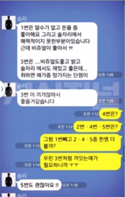 Seungri: Em số 1 ít nói, thích tiền, thiếu ma lực trên bàn rượu nhưng được cái đẹp. Em số 3… đẹp, tính cách tốt, trên bàn rượu rất thú vị… nhưng hễ uống rượu vào thì sụp đổ. Seungri: Em số 3 tài nghệ rất nhiều, chắc chắn là ngon hơn. Giám đốc: Em số 4 thì sao? Em số 2, số 4, số 5 đó? Vậy không cần em số 1, còn 2 4 5 thì đợi xem sao. Chúng ta cần loại con gái như em số 3. Seungri: Em số 5 cũng được lắm. Seungri: Nói được cả tiếng anh nữa Giám đốc: Vậy thì cho xem cả cô số 3 và số 5 đi Seungri: Vâng, em biết rồi Giám đốc: Suy nghĩ một lần về công việc sau này. Hãy cẩn thận với các dự án kinh doanh ở Pháp. Giám đốc: Vậy đã thỏa thuận được với (che mờ) chưa Seungri: Vâng Seungri: (che tên) không có vấn đề gì đâu. Giám đốc: OK. Cô số 3, số 5 tên tuổi nghề nghiệp thế nào, cho anh biết đi. Seungri: Số 3 là nữ thực tập sinh mới (tên công ty bị che) (nguồn dịch: Lostbird)