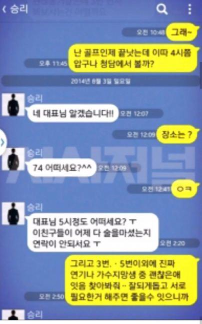 Giám đốc: Vậy hả. Anh sắp chơi golf xong rồi nên 4 giờ gặp nhau ở Cheongdamdong được không? Ngày 3/6/2014 Seungri: Vâng ạ Giám đốc: Địa điểm ở đâu thế? Seungri: Số 74 được không ạ? Giám đốc: OK Seungri: 5 giờ được không giám đốc. Mấy cô này hôm qua uống hơi nhiều, liên lạc không được. Giám đốc: Ngoài cô số 3 và số 5 thì trong đám thực tập sinh giải trí ca sĩ gì đó thì tìm giúp anh một em nào ngon ngon cũng được. Anh sẽ giúp đỡ cho, ai cũng có nhu cầu có qua có lại mà. (nguồn dịch: Lostbird)