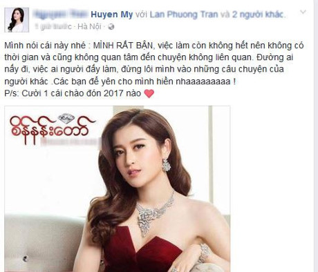 Trước những lời “ném đá” vô lý, Huyền My không thể im lặng, cô quyết định lên tiếng trên Facebook cá nhân: “Mình nói cái này nhé: MÌNH RẤT BẬN, việc làm còn không hết nên không có thời gian và cũng không quan tâm đến chuyện không liên quan. Đường ai nấy đi, việc ai người đấy làm, đừng lôi mình vào những câu chuyện của người khác. Các bạn để yên cho mình hiền nha“.