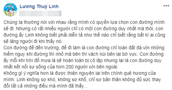 “Con đường đến trường, để đi làm là chỉ toàn đất đá với những hiểm nguy khi đường thì nhỏ, bên vách núi, bên lại bờ vực. Con đường ấy mỗi khi trời đổ mưa sẽ hoàn toàn bị cô lập nhưng lại là con đường duy nhất kết nối sự sống của hơn 200 người với bên ngoài. Không gì ý nghĩa hơn là được thiện nguyện lại trên chính quê hương của mình. Linh không sợ khó, không sợ khổ, chỉ sợ bản thân không đủ sức thay đổi tất cả những điều mà mình đã thấy” - Lương Thùy Linh viết.