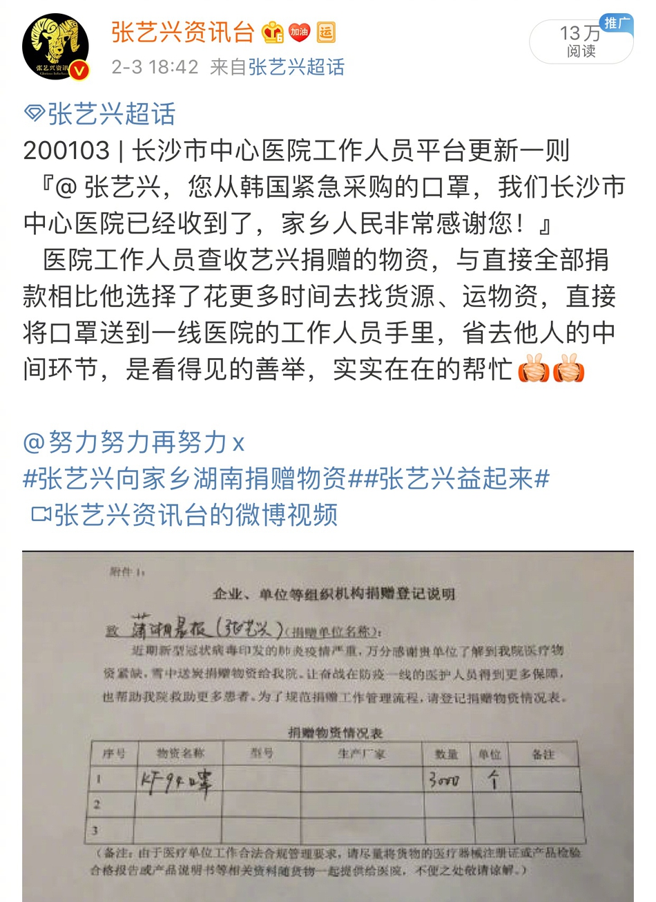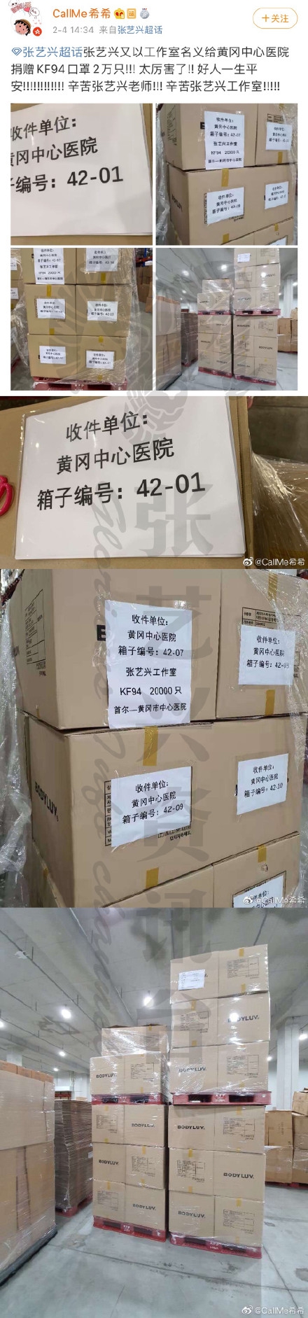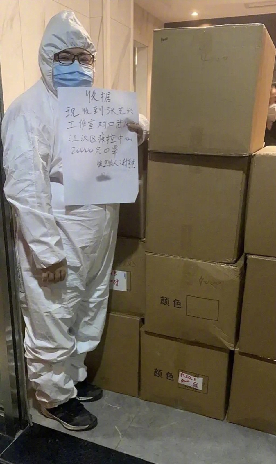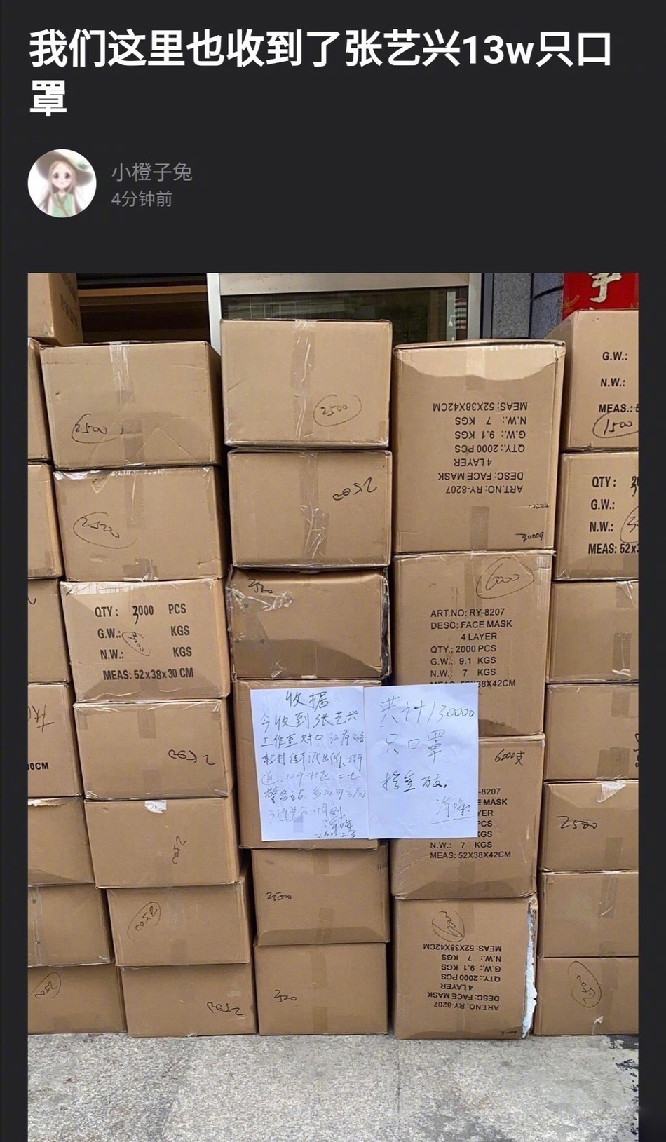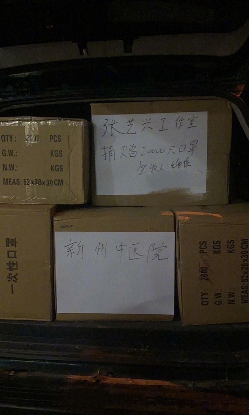 Các cơ sở Trương Nghệ Hưng quyên tặng 60.000 khẩu trang cho Bệnh viện Nhân dân Tân Châu, Bệnh viện Trung tâm Tân Châu, Trung tâm phòng chống bệnh dịch Giang Hán tại Vũ Hán; tặng 20.000 khẩu trang cho Bệnh viện Trung tâm Hoàng Cương Hồ Bắc; ủy thác cho Morning News quyên tặng 24.000 khẩu trang cho Bệnh viện Trung tâm Trường Sa Hồ Nam cùng 3 bệnh viện khác và Sở cảnh sát Trường Sa; quyên 130.000 khẩu trang cho cộng đồng, đường phố, đồn cảnh sát,… Có truyền thông Hồ Nam tiết lộ rằng không ít khẩu trang do Trương Nghệ Hưng khẩn cấp đặt mua bên Hàn Quốc. Đến 15:00 ngày 04/02 (giờ bên Trung Quốc) thì tổng số khẩu trang Trương Nghệ Hưng quyên tặng lên đến hơn 284.000 cái.