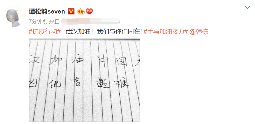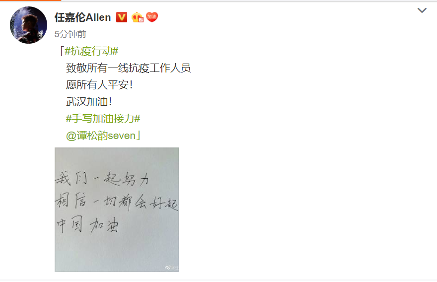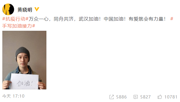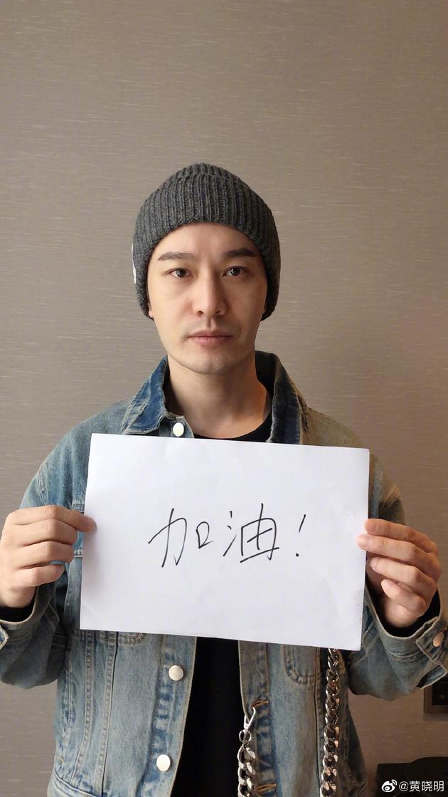 Huỳnh Hiểu Minh cũng đăng tải ảnh viết tay “Cố lên” để động viên tinh thần cho nhân viên y tế đi kèm với nội dung: “Mọi người cùng một lòng cùng vượt qua khó khăn. Vũ Hán cố lên. Trung Quốc cố lên. Có tình yêu sẽ có nhiều năng lượng“.