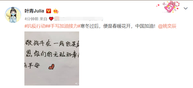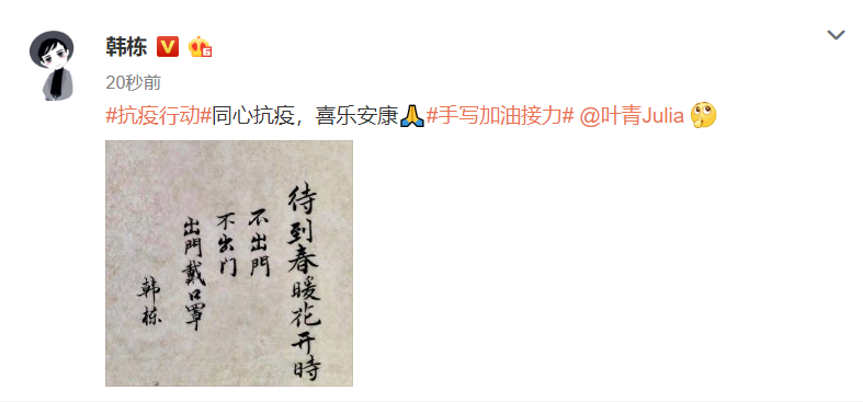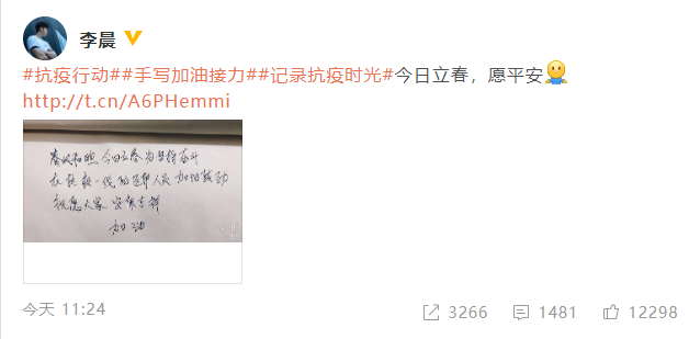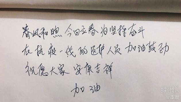Lý Thần chia sẻ hình ảnh chữ viết tay tiếp sức trên Lục Châu với nội dung: “Hôm nay lập xuân, hi vọng bình an”. Trong ảnh Lý Thần viết: “Gió xuân hài hòa, hôm nay lập xuân, tiếp sức cho các nhân viên y tế ở tuyến đầu đang chiến đấu với dịch bệnh. Chúc mọi người bình an và sức khỏe, cố lên!”
