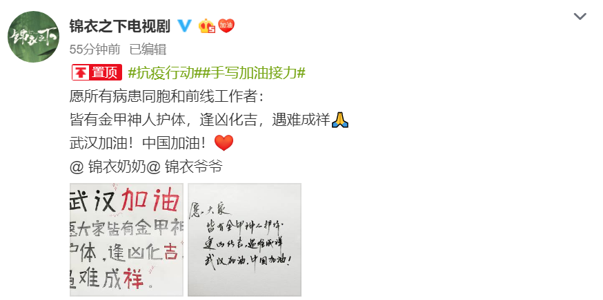 Ngoài việc quyên tặng đầy ý nghĩa của Trương Nghệ Hưng, dàn diễn viên trong Cẩm y chi hạ cũng gửi gắm vài lời nhắn động viên tinh thần cũng như tỏ lòng tôn kính đối với nhân viên y tế tuyến đầu.