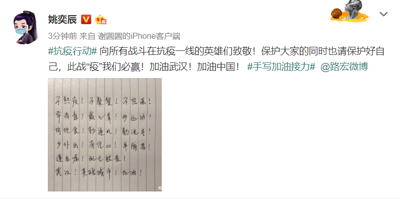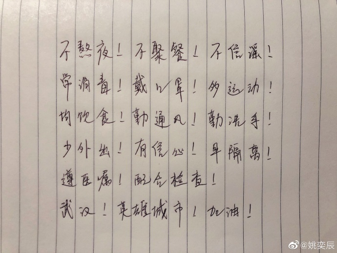 Diêu Dịch Thần viết: Đừng thức khuya, đừng tụ tập, đừng tin những tin đồn nhảm. Thường xuyên diệt khuẩn, đeo khẩu trang, vận động nhiều hơn. Nhớ ăn uống, siêng năng thông gió, siêng năng rửa tay. Ít đi ra ngoài, có niềm tin, sớm cách ly. Tôn trọng nhân viên y tế, phối hợp kiểm tra. Vũ Hán, anh hùng thành thị, cố lên!