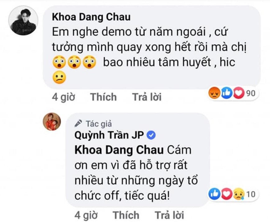 Phía dưới bình luận bài đăng của Quỳnh Trần JP, Châu Đăng Khoa cũng bày tỏ sự tiếc nuối khi MV không thể thực hiện và nhận được lời cảm ơn từ nữ vlogger. Lyly cũng đăng tải lại ảnh màn hình đoạn đối đáp này cùng dòng trạng thái: “Ly cũng không hiểu là phía anh Châu Đăng Khoa đã hỗ trợ rất nhiều gì trong việc này? Thậm chí là hời hợt vô tâm. Vì lúc đó còn trong công ty nên Ly có hỏi ý kiến anh Khoa về việc này, anh Khoa nói “chỉ cần đừng để mọi người hiểu rằng đây là sản phẩm chính thức là được”. Không 1 lời tư vấn“.