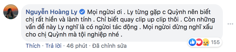 Quay trở lại chia sẻ từ phía Quỳnh Trần JP, Lyly thẳng thắn: “Hôm qua fanpage chị Quỳnh lên bài đề cập đến việc MV sẽ không được thực hiện. Trước đó đã có thông tin cụ thể rằng ngày 1/6 sẽ có MV. Bây giờ là đầu tháng 3, Ly không hiểu là có thật sự là vì mọi người hỏi quá nhiều mà fanpage chị Quỳnh phải lên tiếng không, hay vì lí do nào khác? (Ly chỉ nói là fanpage vì Ly không nghĩ stt đó do chính chị Quỳnh đăng tải).