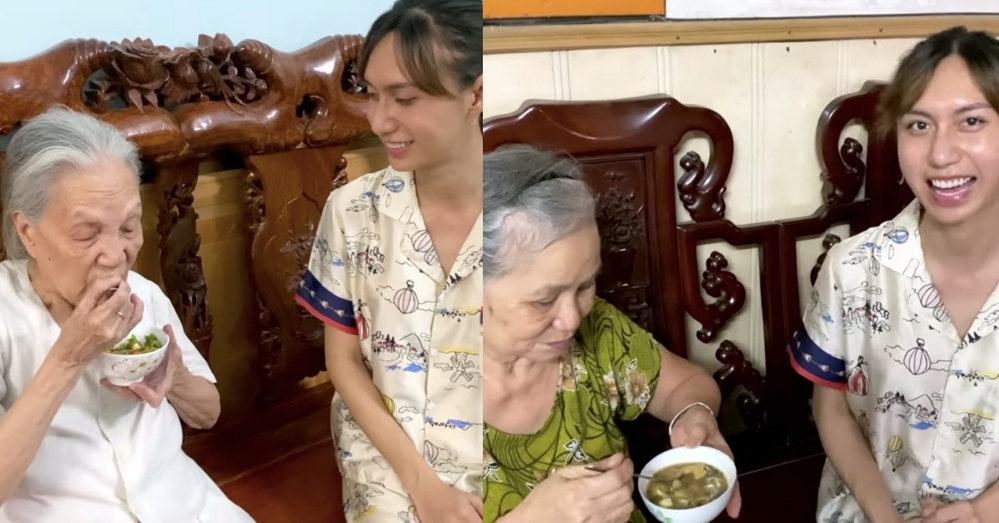Sau khi làm xong món trứng cút lộn xào me, Lynk Lee đã mang thành phẩm của mình cho bà nội và bà ngoại thưởng thức. Và cả hai bà tấm tắc khen ngon.