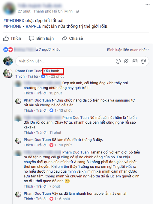 Đức Tuấn nhanh chóng chê iPhone X tại dòng trạng thái của một người hâm mộ nhà “táo khuyết”, sau thời điểm sản phẩm này trình làng.